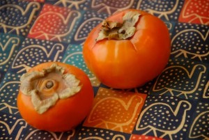 Winter Reds Salad with Pomegranate Dressing A festive red, green, and orange winter salad with pomegranate seeds and dressing, Fuyu persimmon, red pear, and greens.