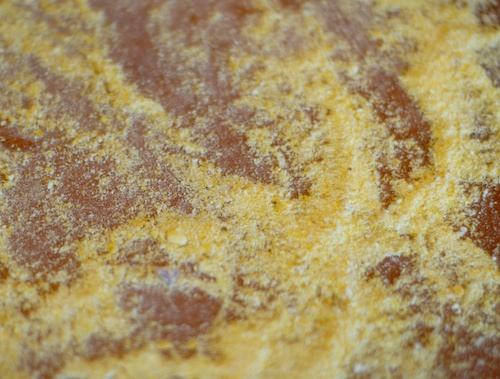 coarse cornmeal on cutting board for rolling out pizza