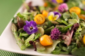 Spring Salad with Fava Beans, Asparagus, Chive and Viola Flowers A fresh salad with spring ingredients: violas, chives, asparagus, fava beans, plus yellow cherry tomatoes.